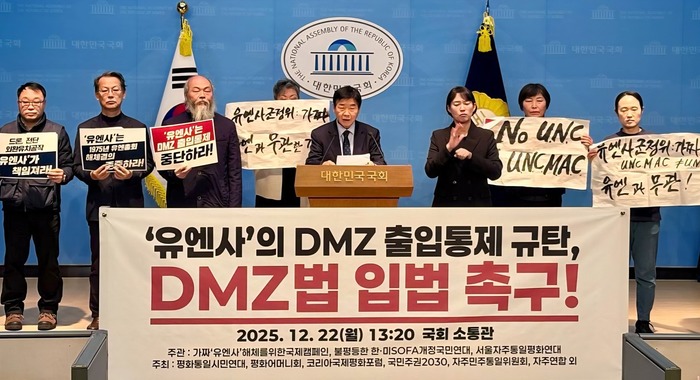 각계 단체와 정당이 한국 영토인 비무장지대(DMZ)의 출입을 통제하며 주권을 침해하는 유엔사의 행태를 22일 한목소리로 규탄했다.